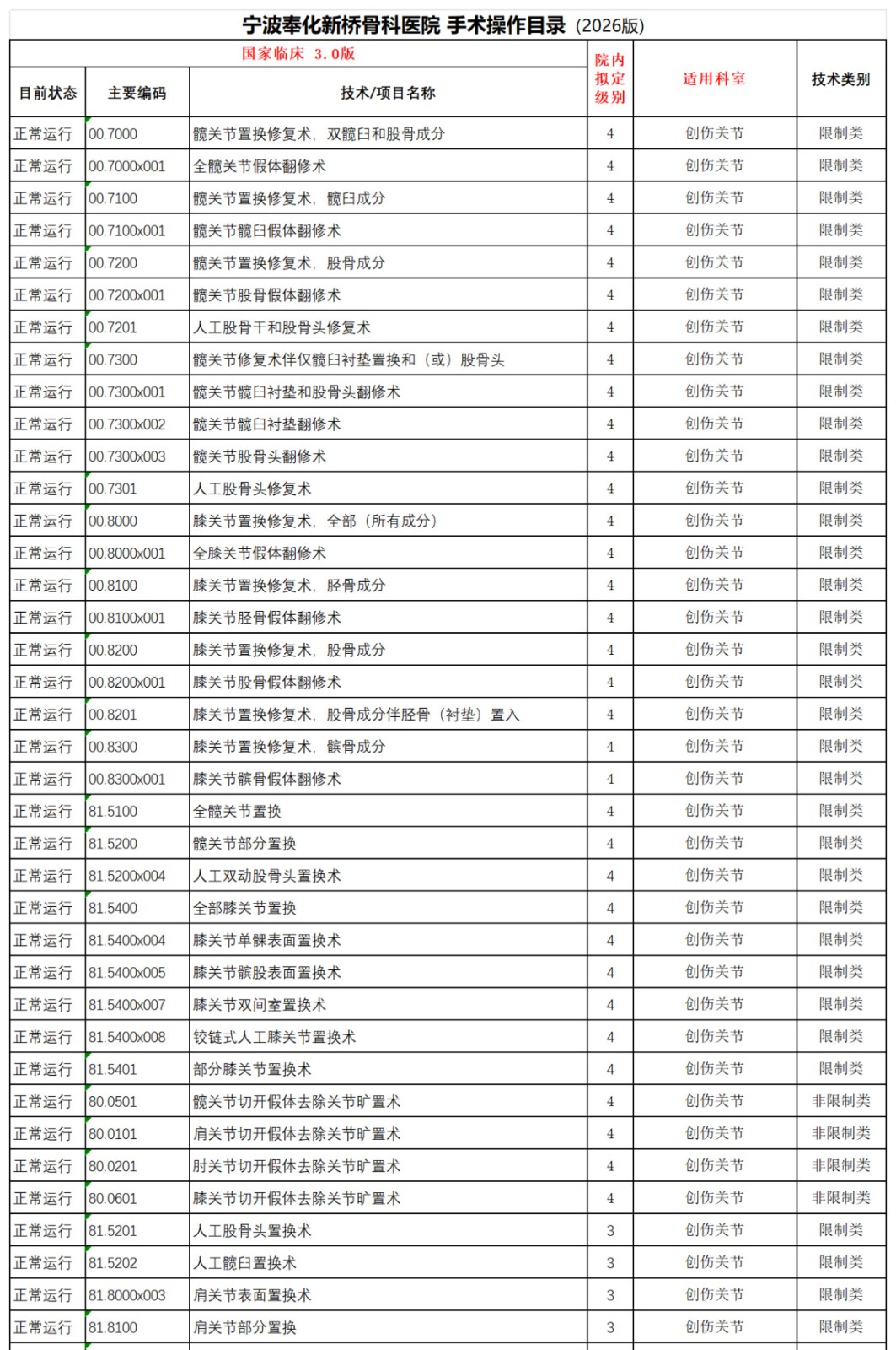 宁波奉化新桥骨科医院三、四级手术/操作目录(2026年版)